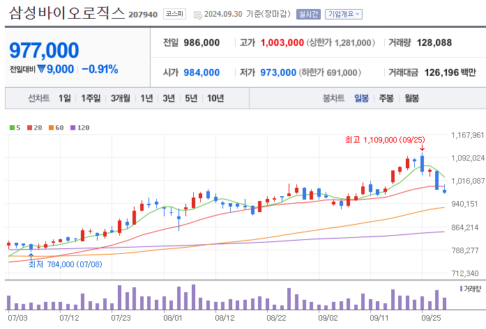 ◆ 오늘 주가: 2024년 9월 30일 최고 주가는1,003,000원, 바이오 시장에서의 성장 가능성에 투자자들이 다시 한번 열광하고 있습니다!