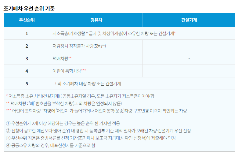 2024년부터는 저소득층 및 생계형 차량 소유자에게 우선적으로 지원금을 배정하는 제도가 시행되었습니다. 이들 계층은 최우선적으로 지원을 받게 되며, 폐차 후 신차 구매 시 추가 지원금을 받을 수 있습니다. 또한 소상공인이 소유한 생계형 차량도 이와 유사한 혜택을 받을 수 있습니다.