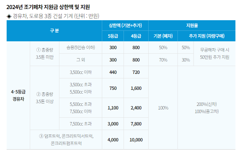 - 대형 차량 및 건설기계: 덤프트럭, 콘크리트 믹서 트럭 등 대형 차량의 경우 최대 4천만 원까지 지원 가능합니다. 또한, **저소득층 이나 소상공인 소유 차량은 지원금에 추가 100만 원 이 더 지급됩니다. 이러한 혜택은 차량의 **연식, 사용 상태**에 따라 결정되며, 추가로 신차(전기차, 수소차 등)를 구매할 경우 **추가 지원**이 가능합니다.