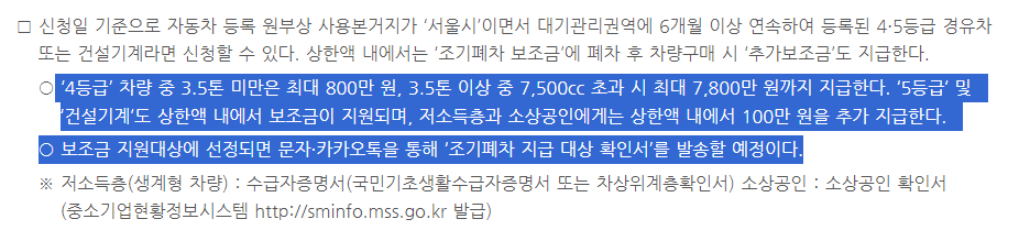 - 서울시는 9월 10부터 일까지 '2024년 제 4차 노후 경유차, 건설기계 조기 폐차 지원을 신청 받고 있습니다. 예산 소신시까지 진행 되니까 보조금 지급 서두르세요!!