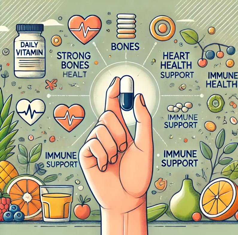 멀티비타민은 일상생활에서 필요한 다양한 비타민과 미네랄을 한 번에 섭취할 수 있는 영양제입니다. 비타민 A, C, B군, E등은 신체 기능을 유지하고 피로 회복 을 도와줍니다. 특히, 비타민 B군은 에너지 생성과 신진대사에 중요한 역할을 하며, 비타민 C는 항산화 작용을 통해 세포 손상을 막고 면역력을 높이는 데 도움을 줍니다.