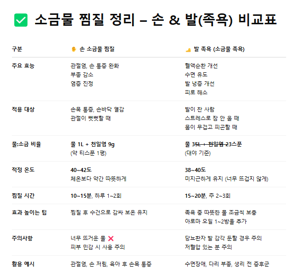 - 손이 욱신거릴 때 → 소금물 손 찜질 15분