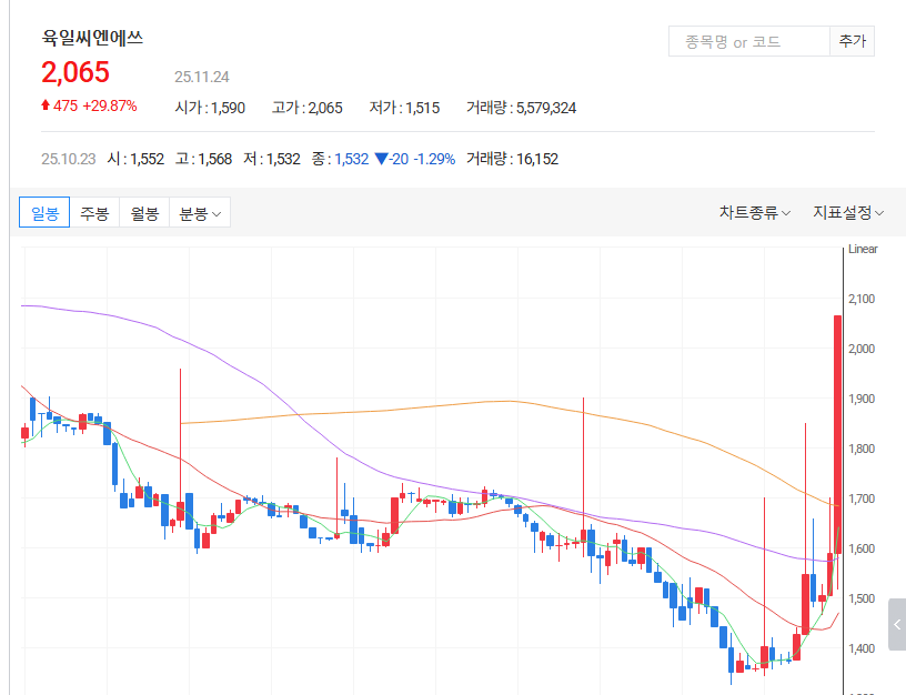 | 옥일씨엔에쓰 | 2,065 | ▲475 | +29.88% | 5,626,898 |