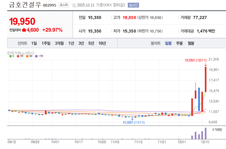 | 금호건설우 | 19,950원 | +29.97% | 77,259 |