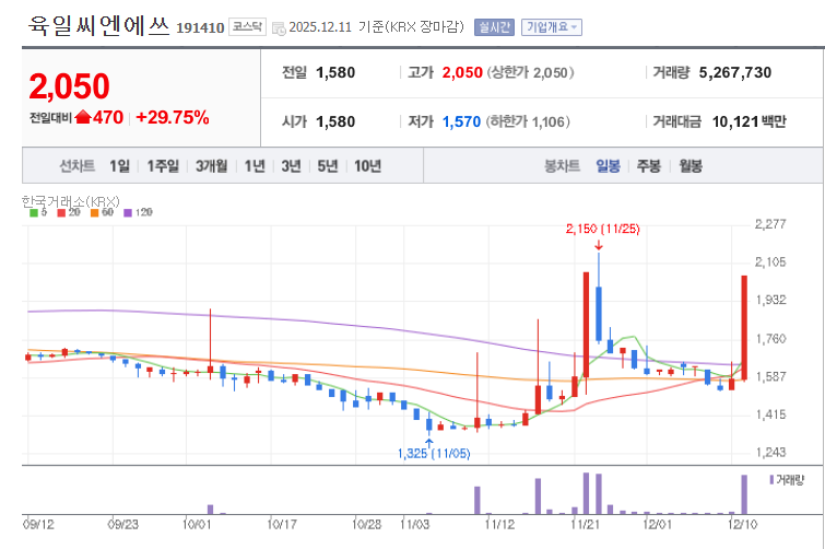 | 육일씨엔에쓰 | 2,050원 | +29.75% | 5,275,547 |