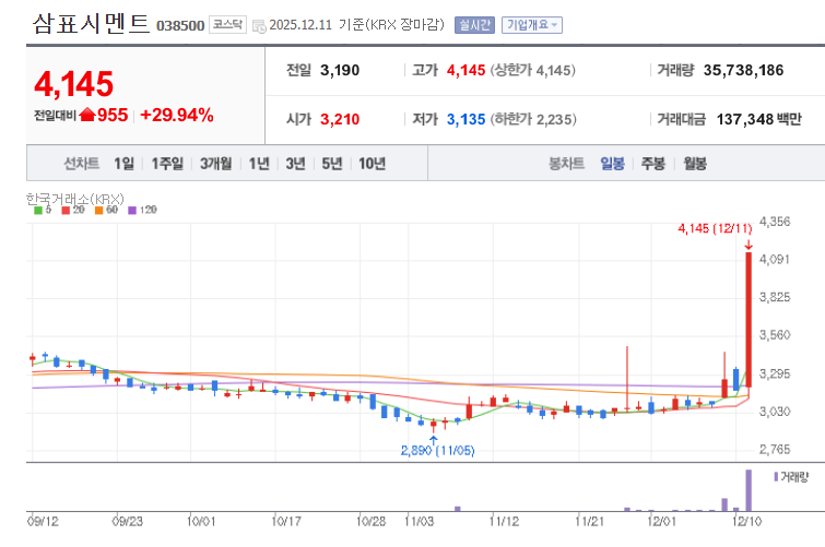| 삼표시멘트 | 4,145원 | +29.34% | 35,741,422 |