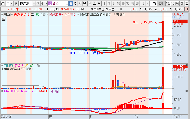 | 웹스 | 2,115 | +29.99% | 1,918,446 | 1 |