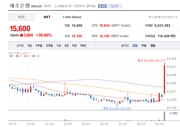- 제주은행 15,600 ▲ 3,600 +30.00%